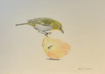 A Cape White-eye on a deadfall apple (The Cape white-eye is endemic to much of Southern Africa with a similar species found across much of Asia)). The 8.5 x 12 inch drawing has been done on 300gsm Saunders Waterford paper using Faber Castell Polychromos oil-based coloured pencils.