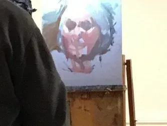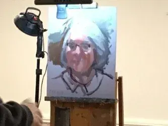 During a live demonstration with volunteer Brenda, Stewart began by sketching the face and central features on a mid-grey painted board, using broad, fluid brushstrokes. The initial palette included a blend of black, white, and chromium green for the hair, complemented by a generic light skin tone. He emphasised starting with the lightest tones and considering their relationship to surrounding areas, noting that early stages involve a degree of uncertainty.